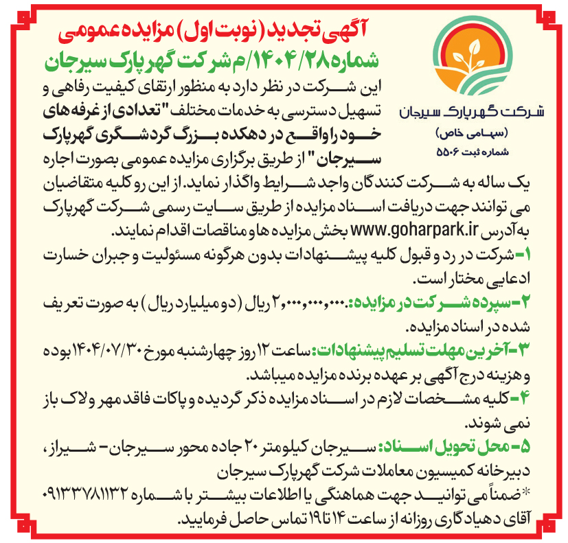 آگهی تجدید (نوبت اول) مزایده تعدادی از غرفه های خود را واقع در دهکده بزرگ گردشگری گهرپارک سیرجان