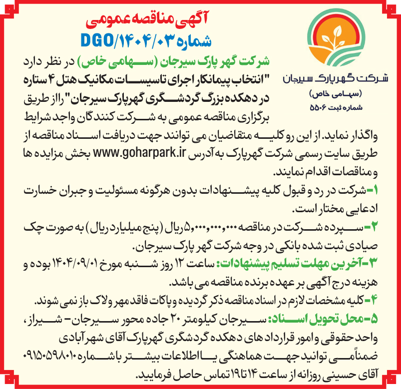 آگهی مناقصه انتخاب پیمانکار اجرای تاسیسات مکانیک هتل 4 ستاره در دهکده بزرگ گردشگری گهرپارک سیرجان