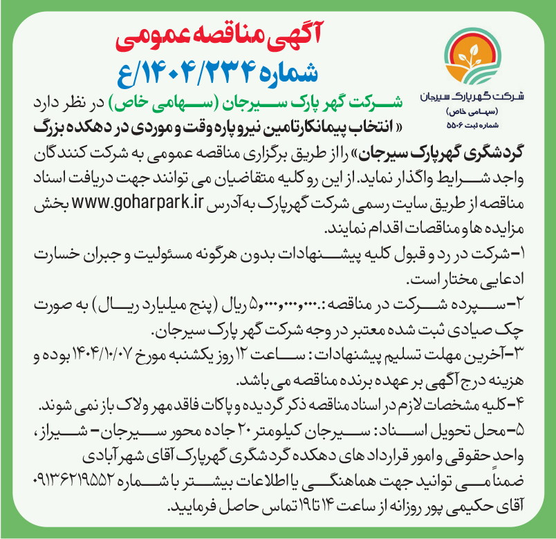 آگهی مناقصه انتخاب پیمانکار تامین نیرو پاره وقت و موردی در دهکده بزرگ گردشگری گهرپارک سیرجان