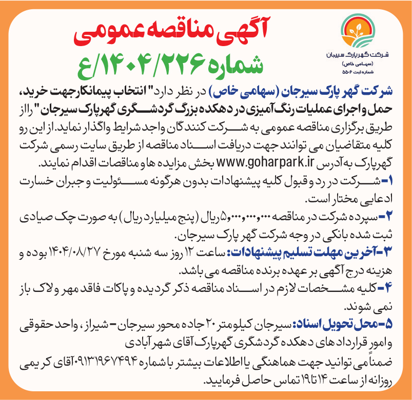 آگهی مناقصه انتخاب پیمانکار جهت خرید حمل و اجرای عملیات رنگ آمیزی در دهکده بزرگ گردشگری گهرپارک سیرجان