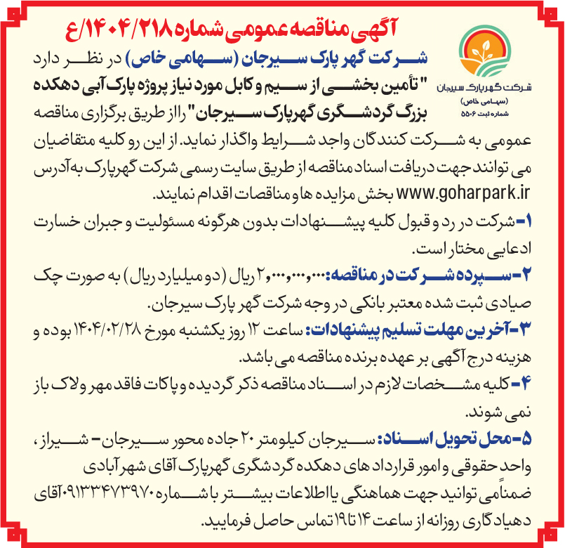 آگهی مناقصه تامین بخشی از سیم و کابل مورد نیاز پروژه پارک آبی دهکده بزرگ گردشگری گهرپارک سیرجان